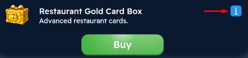 - Restaurant Revenue Bonus card: There are 4 different card types: Green, Blue, Purple, and Gold. These card types give you a bonus that increases your restaurant revenue based on the rarity of the card.
